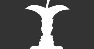 Literal illusions occur when two images are interpreted to look like one image. Your eyes view these images separately, but the brain interprets it as a single, fluid picture. For example, the literal illusion below depicts both an apple core (in white) and two people looking at each other (in black). The brain uses a “filling-in” phenomena, which occurs when it decides which part of the image to focus on, and how to interpret the empty space.